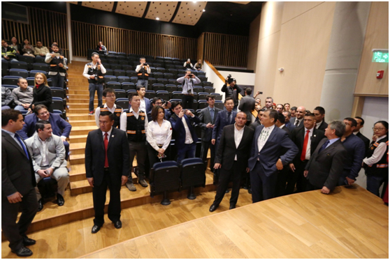 上午8时,科雷亚总统在国家议会副议长、经济政策协调部部长、财政部部长、国家社保部部长、税务局局长、不动产管理委员会主任、工程管理委员会主任等15位部级官员的陪同下视察了已入驻办公的政府机关及金融机构,随后在大楼西侧广场致辞。科雷亚总统强调,政府金融管理平台是全国最大的单体建筑,其交付使用是厄瓜多尔国家政府新形象的完美写照,而超过5100名公务员集中办公的模式也将帮助政府机构优化整合资源并进一步提升服务质量。致辞中,科雷亚总统多次感谢中工国际在该项目中所付出的努力。最后,科雷亚总统正式宣布金融平台正式交付使用。