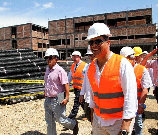 当地时间2014年9月23日上午12点40分,厄瓜多尔共和国总统科雷亚先生,在国家工程管理委员会主任马塞罗.莱昂、不动产管理委员会、卫生部及当地政府官员的陪同下,视察了由我公司承担项目管理工作的厄瓜多尔大型医院建设项目,我公司该项目的项目经理肖总、商务经理王翔及该项目部其他成员参加了此次活动。